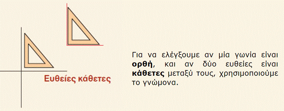 Επίσης, θυμήσου ότι υπάρχει και δεύτερος τρόπος να ελέγξουμε αν μία γωνία είναι ορθή και δύο ευθείες κάθετες μεταξύ τους, χρησιμοποιώντας το μοιρογνωμόνιο: