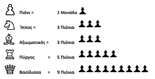 - Κάθε σκακιστικό κομμάτι αντιστοιχεί σε κάποιους πόντους, σύμφωνα με τον παρακάτω πίνακα: