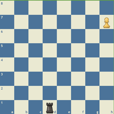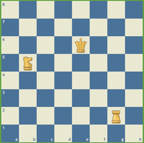 - Ο προσδιορισμός των τετραγώνων για την κάθε “μαντεψιά” γίνεται με τα γράμματα και τους αριθμούς που αντιστοιχούν στις γραμμές και στις στήλες της σκακιέρας. Για παράδειγμα, στην παρακάτω εικόνα η λευκή Βασίλισσα βρίσκεται στο τετράγωνο Ε6 (e6 με τη διεθνή γραφή), ο λευκός Ίππος στο τετράγωνο Β5 (b5 με τη διεθνή γραφή) και ο λευκός Πύργος στο τετράγωνο Η2 (g2 με τη διεθνή γραφή).